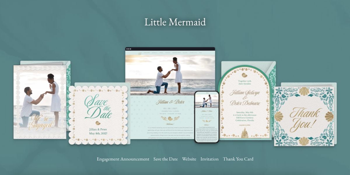Little Mermaid engagement stationery with ocean magic—cards and website for $10. Ideal for Disney fans celebrating love!.