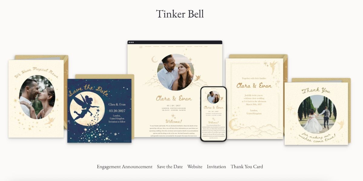 Tinker Bell-themed wedding suite with fairy-tale cards, website, and magical couple photos—Disney enchantment for $10.