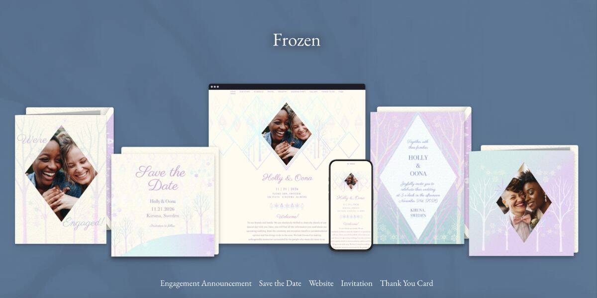 Frozen"-inspired wedding suite and website, evoking Disney enchantment with pastel elegance and joyful couple portraits.