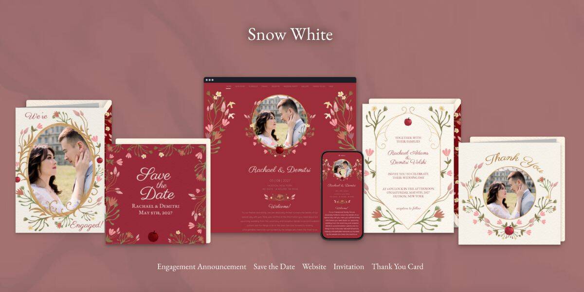 Disney-themed wedding invite set displayed on screens and paper; loving couple strolls through a magical park backdrop.