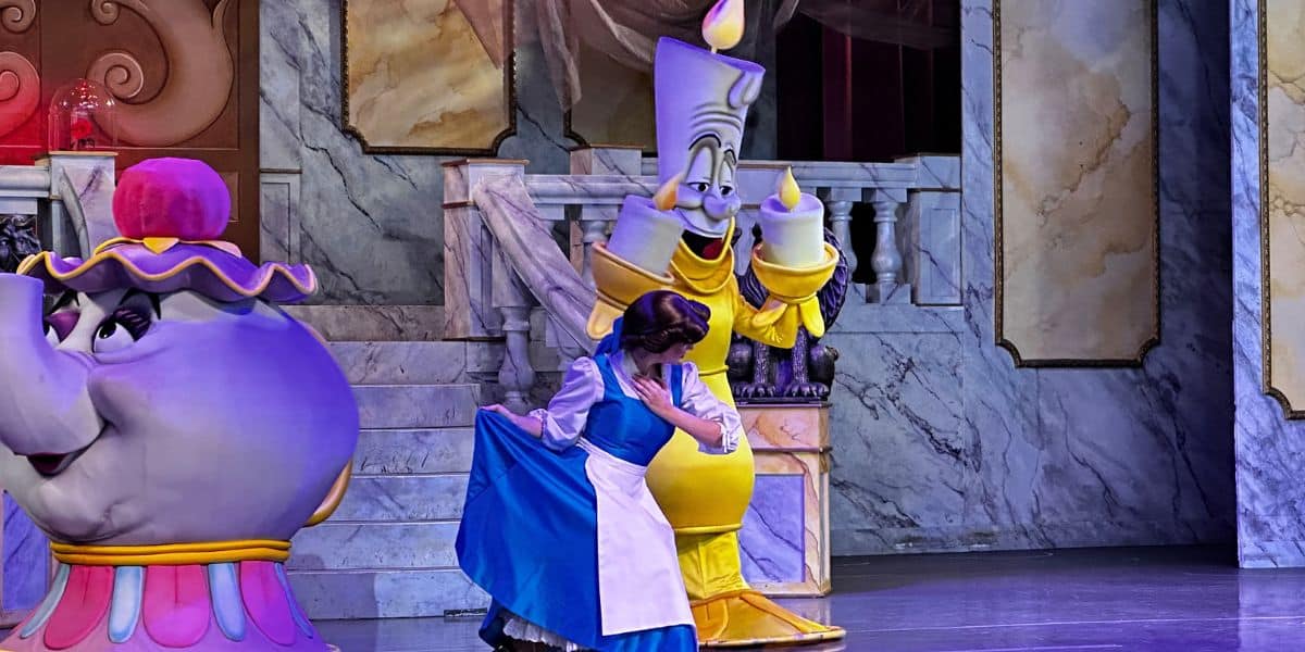 The production continues to satisfy Disney park and movie lovers alike, though fans hope the Belle banner will be replaced quickly to restore the theater’s complete visual presentation.