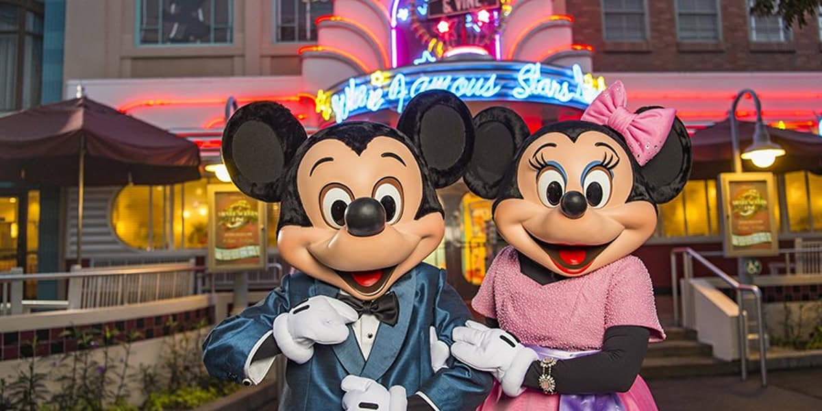 Mickey Mouse in a tuxedo and Minnie Mouse in a pink dress pose together, smiling, for a magical Disney Date night in front of a brightly lit, neon-decorated building at night.