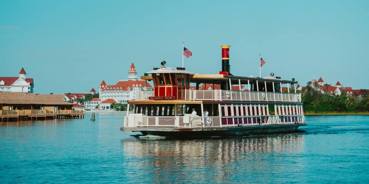 A Walt Disney World ferry boat in front of the Grand Floridian Resort & Spa.