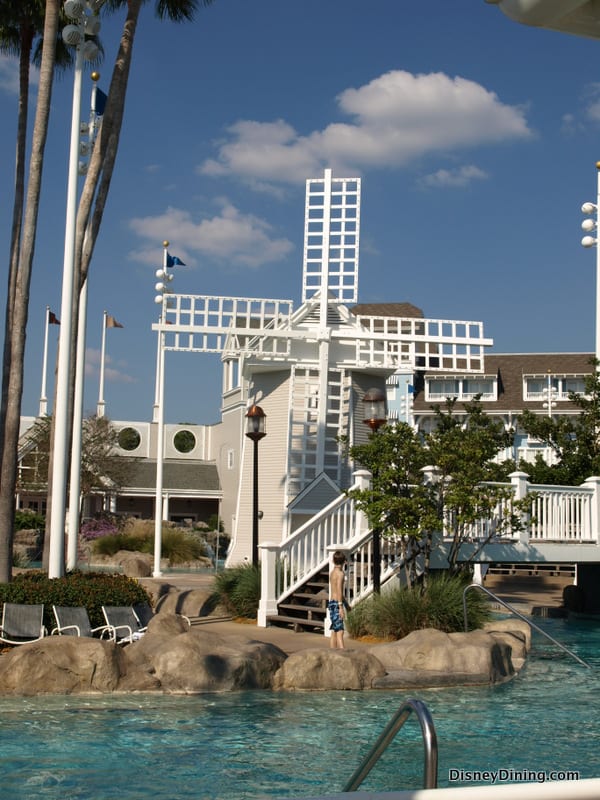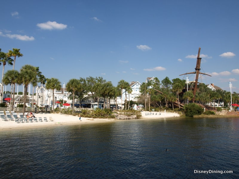 We arrived to the Yacht and Beach Club Resort on the most convenient form of transportation in the area, the ferryboat, which makes stops at Epcot, Hollywood Studios, The Boardwalk, The Swan and Dolphin, and, of course, Disney’s Yacht and Beach Club. Approaching from the water is a far more rewarding experience than the front door, as you get a complete look at the beautiful facilities, complete with pirate ship and windmill.