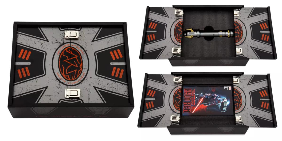A simple push of a switch activates realistic Lightsaber sound effects, and when paired with one of Disney’s Lightsaber Blades (sold separately), it emits an ominous red glow that reflects the dark energy of its wielders.