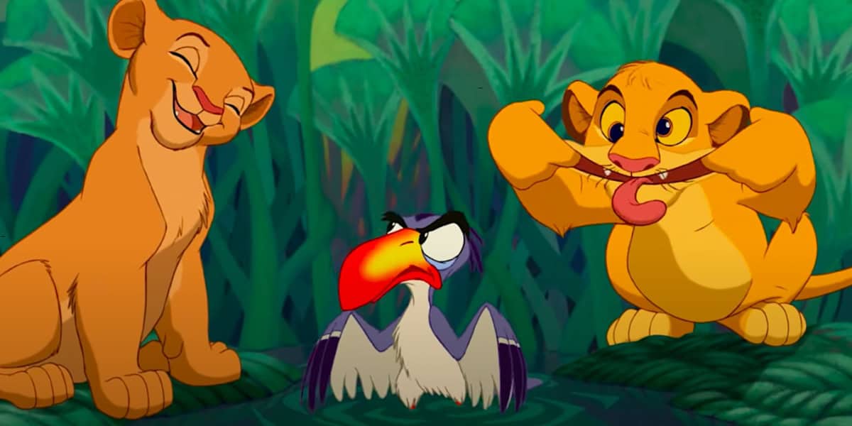 A scene from an animated movie shows two lion cubs, one laughing with eyes closed and the other making a funny face by pulling the corners of its mouth. Between them is a disgruntled bird with a large red beak and a white belly. Lush greenery surrounds them.