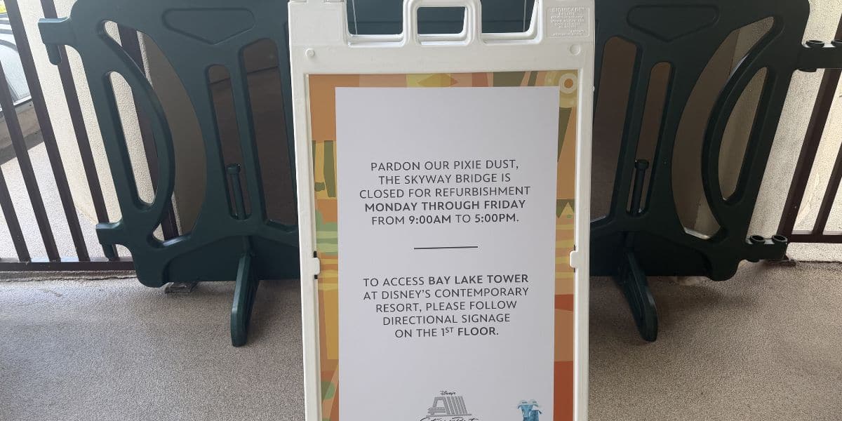 The skyway bridge connecting Bay Lake Tower to the Contemporary Resort is closed to guests between 9:00 a.m. and 5:00 p.m., Monday through Friday. Evenings, weekends, and holidays are not affected. Outside that weekday window, the bridge is operating normally.