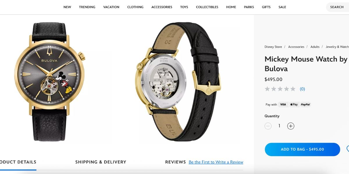 The Bulova Mickey watch retails for $495. The design features a gold-tone round case with a black leather strap and a black dial showing Mickey standing on his tiptoes between the 4 and 5 numerals. Gold-tone details appear on the crown, case, and numerals throughout. Bulova has over 140 years of watchmaking history and the brand’s reputation for quality movement and construction puts this firmly in legitimate luxury timepiece territory rather than novelty souvenir territory.