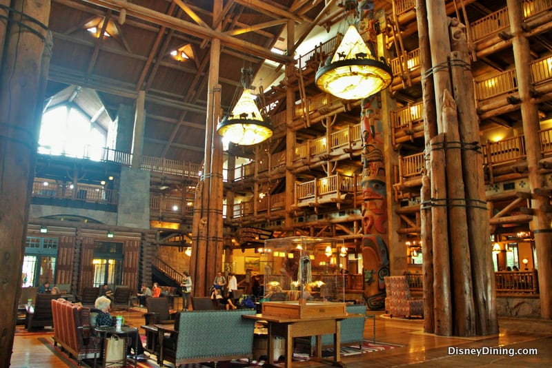The blazing fireplace surrounded by rocking chairs scattered under the gorgeous totem poles in the lobby of Disney’s Wilderness Lodge is the picture of serenity and relaxation. Styled after the National Parks of the American Northwest, this Resort is complete with waterfalls, a stream running through the lobby, and a working old faithful geyser active every half hour.