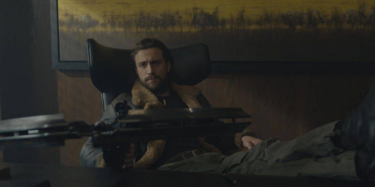 A man sitting in a chair holding a gun, evoking a tense scene reminiscent of an intense MCU moment.