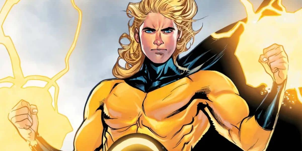 A muscular superhero with long blonde hair, glowing blue eyes, and a determined expression, wears a yellow and black suit with a cape inspired by the MCU. Light glows from their fists and chest, radiating energy.