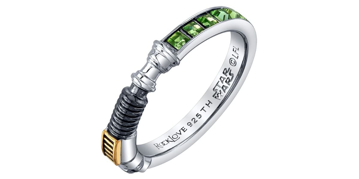 On the Star Wars side, the Luke Skywalker Crystal Lightsaber Ring at $85, combining sterling silver, Austrian crystal, 14K yellow gold plate, and black rhodium, is still available in sizes five through thirteen — though several were nearly gone.