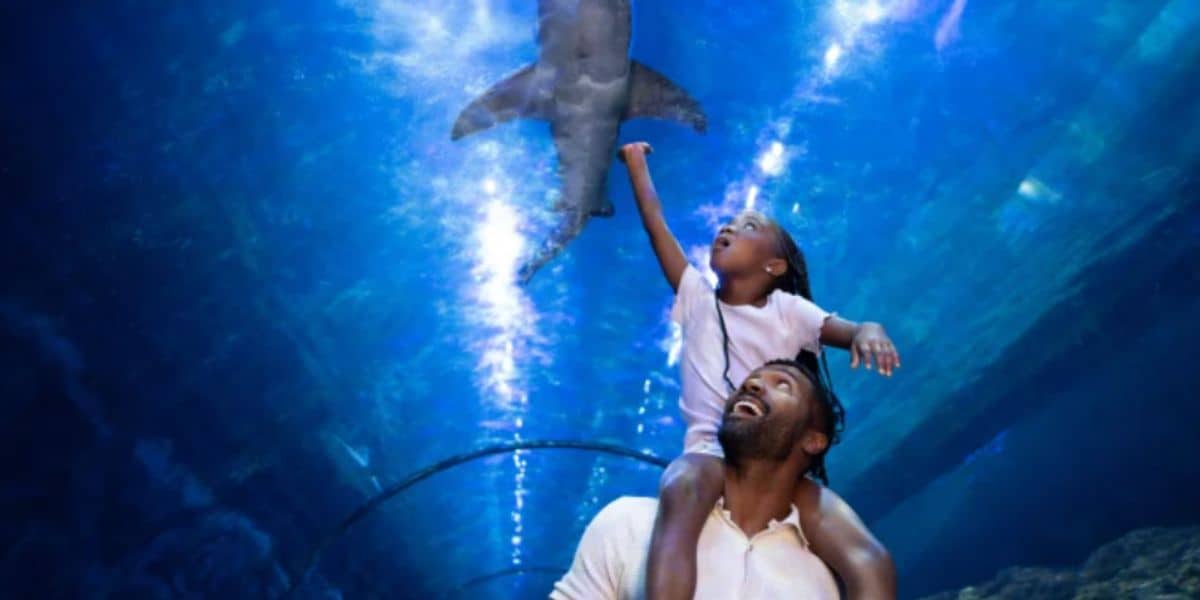 Guests experience the thrill as a child on her dad’s shoulders reaches for a shark above in SeaWorld San Diego’s underwater tunnel in May.