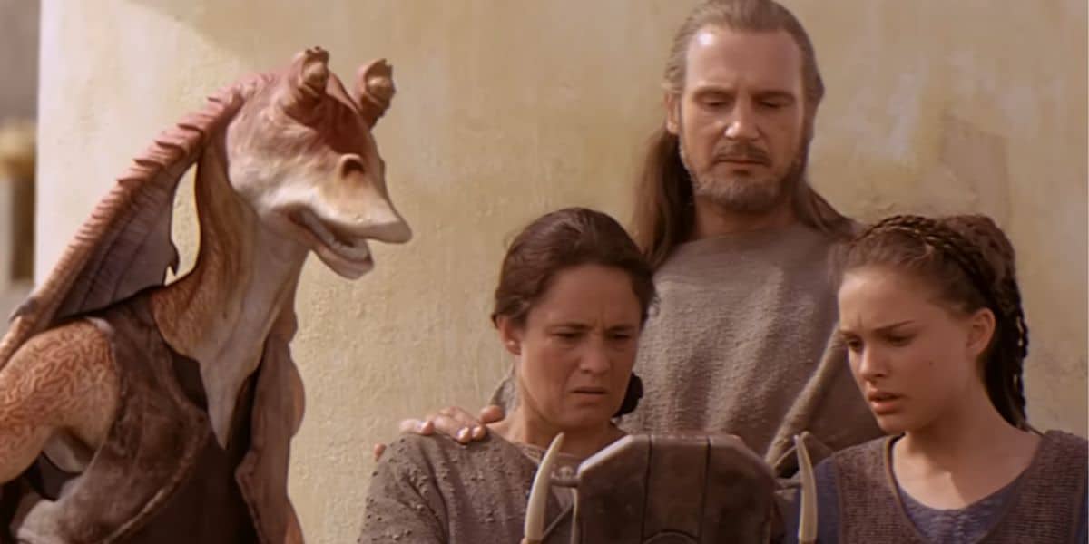 L to R: Jar Jar, Shmi, Qui-Gon, and Padmé watching the podrace in 'The Phantom Menace'