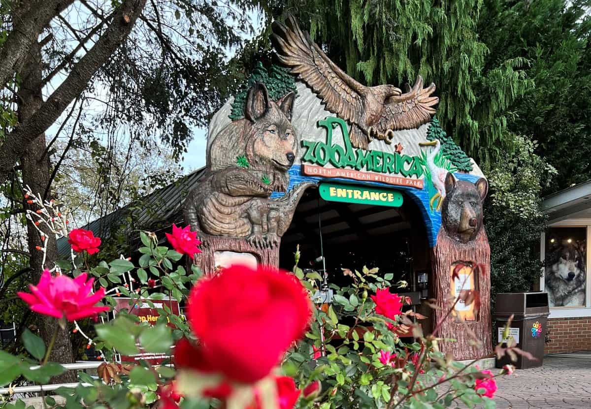 Entrance of ZooAmerica with a decorative arch featuring carved animals like a wolf, bear, and eagle. Vibrant red roses are in the foreground, partially obscuring the view. Trees are visible in the background at this theme park.