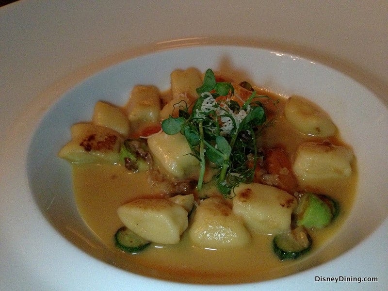 As soon as we placed our orders, we were brought a gift from the chef (the award winning Scott Hunnel whom I am convinced is superhuman) called Amuse-Bouche. This was a trio of one-bite seafood delights: a smoked salmon panna cotta, a smoked salmon cube and a king crab crepe. The presentation alone was something to behold. This was very obviously made by a master artist. The salmon was delectable and tender, the panna cotta was light, creamy and inventive (topped with a tiny hidden mickey made of roe) and the king crab crepe (my favorite) was a true masterpiece. Amuse-Bouche means “amuse the mouth” and the single, bite-sized hor d’oeuvres certainly did that.