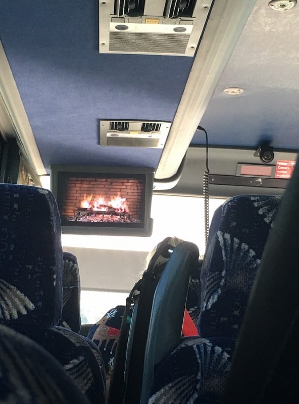 On board the motor coach was another “little” detail that makes everything feel more special and pulled together, the TVs on the motor coach were showing the Disney’s Magical Fireplace Yule Log DVD. I thought it was really a cute touch.