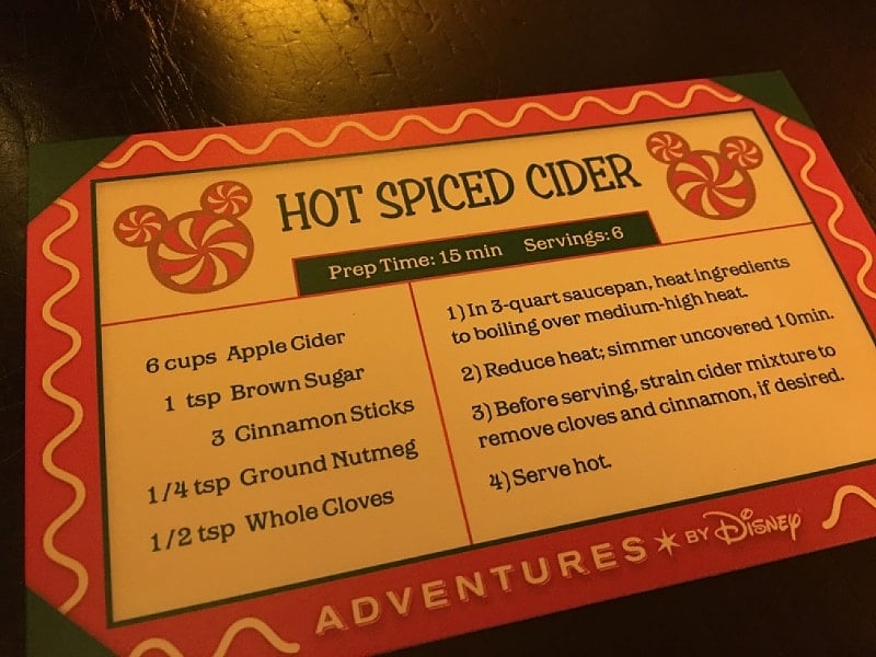 Back on the bus we were given a light snack: Mickey head rice krispie treats. YUM! And we headed to our final stop, the Wilderness Lodge. Of all of the resorts, Wilderness Lodge to me is the most Christmas-y, warm & inviting for the holidays. We went to the Territory Lounge where we were served tiny mugs of hot spiced apple cider, and we were given the recipe to take home. The guides used this time and space to wrap up and conclude the tour experience.