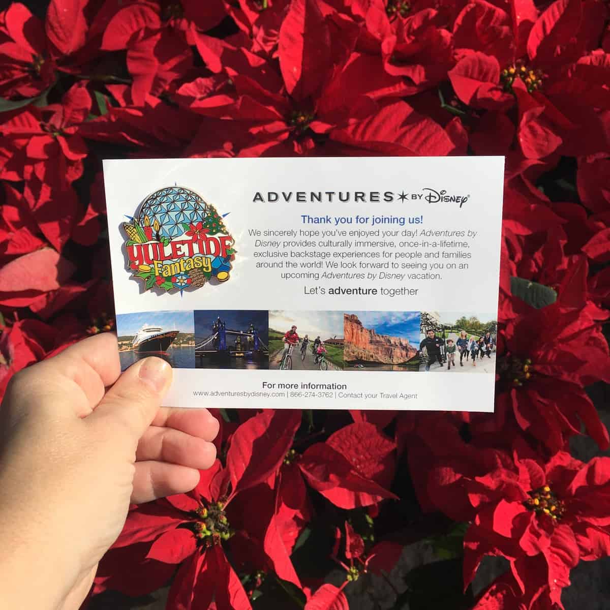 At the end of the tour we were given really nice pins commemorating the experience. These were attached to an Adventures by Disney postcard (some nice cross-marketing). And it had the website and code to access the photos that were taken during the tour so we could download those (free of charge)