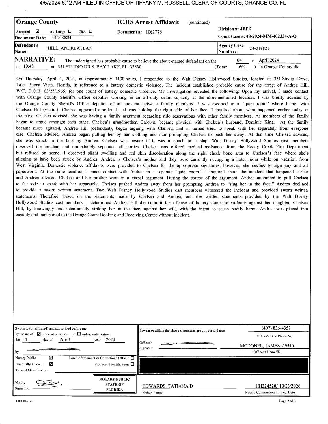 According to a recently released report from the Orange County Sheriff’s Office, Andrea Jean Hill was arrested last month at Disney’s Hollywood Studios after punching her daughter in the face.